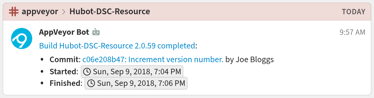 1. Create a bot for AppVeyor. Make sure that you select Incoming webhook as the Bot type.